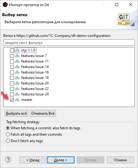 - 1C:EDT соединится с удаленным репозиторием и покажет, что в нем есть несколько веток;