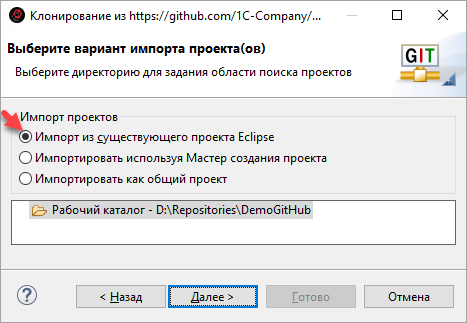 В этом примере демонстрируется подключение к публичному репозиторию фирмы «1С» на GitHub и