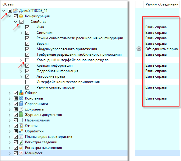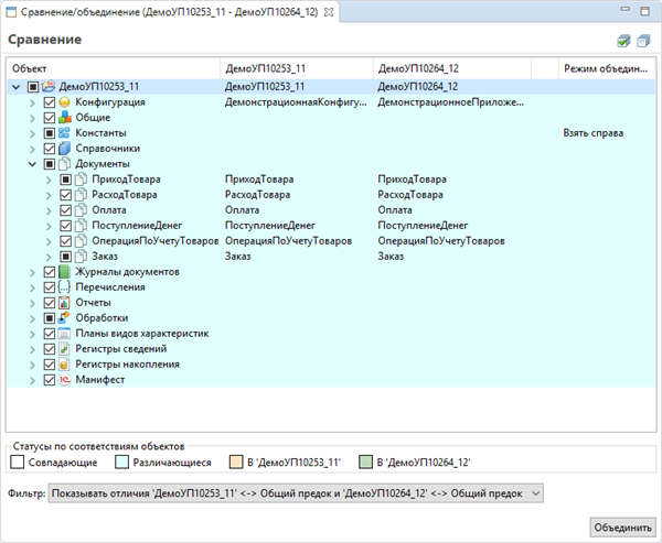 Этот редактор позволяет вам просматривать отличия одной конфигурации от другой, отмечать объекты и свойства, которые следует (или, наоборот, не следует) перенести в главную конфигурацию, и выполнять объединение двух конфигураций. Также из этого редактора можно вызвать редактор сравнения и объединения текстовых файлов (подробнее) — с его помощью можно для каждого модуля в отдельности выполнить сравнение и при необходимости отредактировать текст, который должен получиться в результате объединения двух модулей.