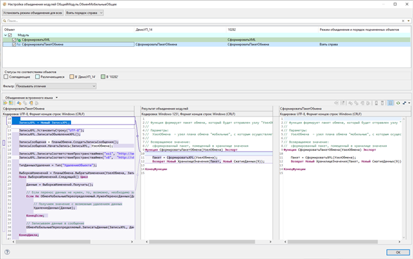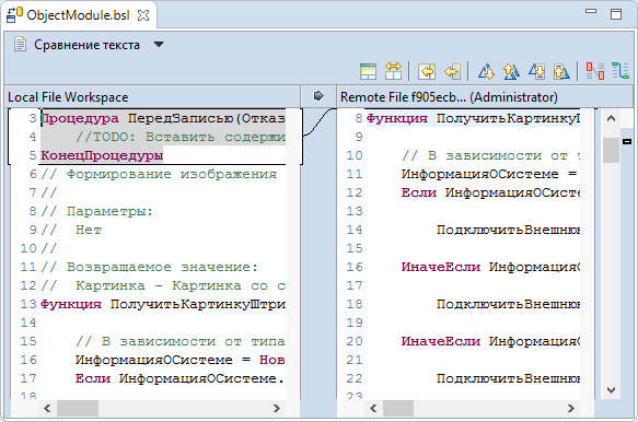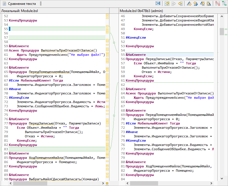 Редактор сравнения и объединения текстовых файлов можно использовать, например, для сравнения двух общих модулей. Также мы интегрировали его в редактор сравнения и объединения конфигураций, поэтому при сравнении модулей будет также использоваться этот редактор.