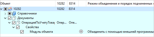 Настройка объединения представляет собой совокупность флажка (в первой колонке слева) и режима объединения (в последней колонке). Такая настройка есть у каждого узла в дереве (у каждой строки).