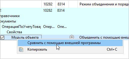 Прежде чем выполнять объединение, можно проанализировать некоторые модули. Для этого нажмите Сравнить с помощью внешней программы контекстном меню модуля.