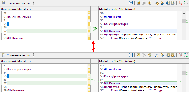 В этой панели реализован встроенный в 1C:EDT механизм сравнения файлов. Его преимущество заключается в том, что он учитывает семантику и может определять перемещение фрагментов кода (процедур и функций). Например, можно включить показ изменения порядка