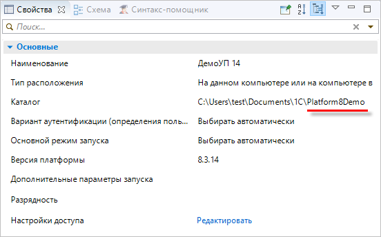 - В панели Свойства в свойстве Каталог будет указан каталог информационной базы, запомните его окончание;