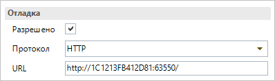 - В группе Отладка установите флажок Разрешено и в поле URL вставьте из буфера обмена адрес сервера отладки.