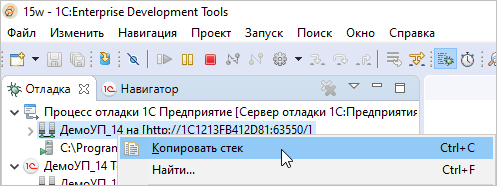 - Cкопируйте в буфер обмена адрес сервера отладки. Для этого нажмите Копировать стек в контекстном меню панели Отладка;
