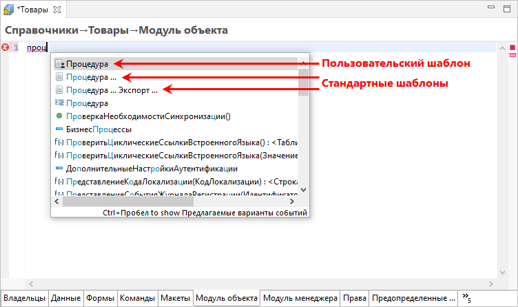 На второй странице контекстной подсказки (повторное нажатие Ctrl+Пробел) расположены все пользовательские шаблоны и обработчики событий, доступные в модуле.