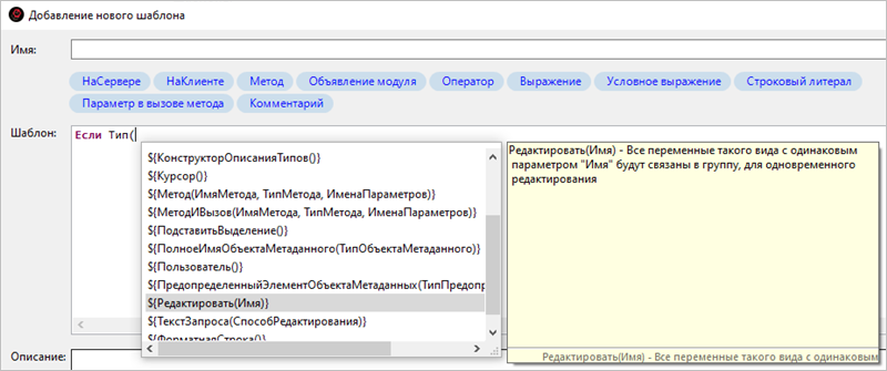 Следующий шаблон показывает особенности использования переменной ${Редактировать()}: