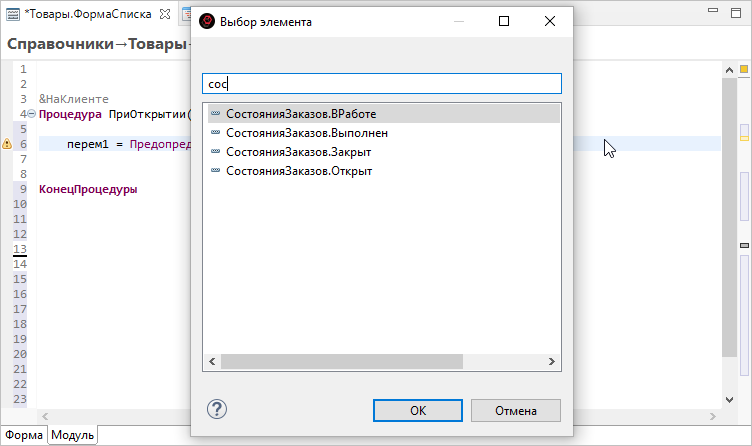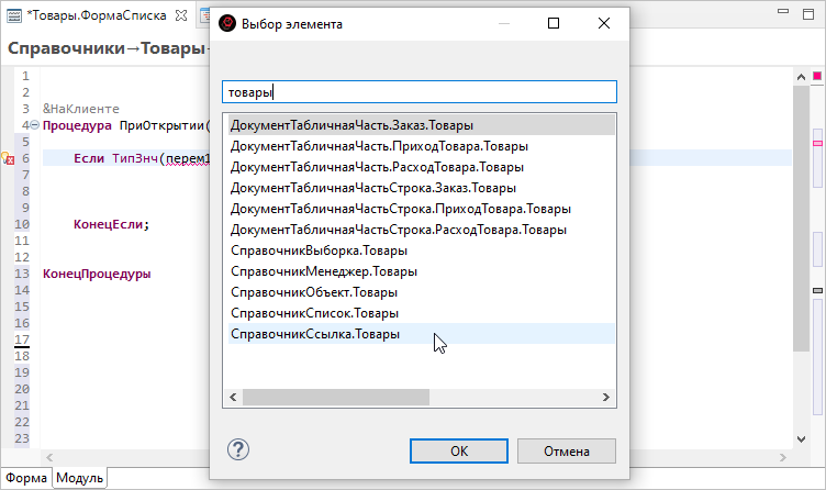Можно перемещаться между маркерами, нажимая Tab и Shift+Tab. В первом маркере вы можете вводить текст, а при переходе на второй маркер 1C:EDT откроет диалог выбора типа.