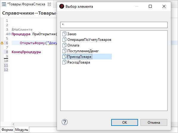 Переменная ${Выбрать()} предлагает выбрать одно из перечисленных значений. Например, в операторе открытия формы требуется указать тип открываемой формы или конкретное имя формы. Набор этих вариантов ограничен и его можно перечислить в переменной ${Выбрать()}.