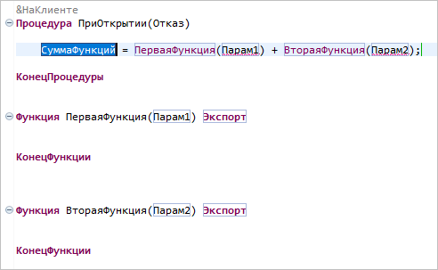 ${Редактировать(СуммаФункций)} = ${МетодИВызов(ПерваяФункция, Функция, Парам1)} + ${МетодИВызов(ВтораяФункция, Функция, Парам2)};
