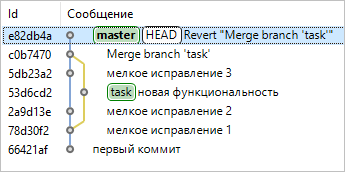 Важно: Имейте в виду, что возвращение к предыдущему состоянию после коммита слияния фактически означает то, что изменения, которые были во вливаемой ветке task, больше не попадут в основную ветку master. Если впоследствии вы внесете изменения в task и захотите снова влить эту ветку в master, то вольются только те изменения, которые были выполнены в task после «отмены» коммита слияния.