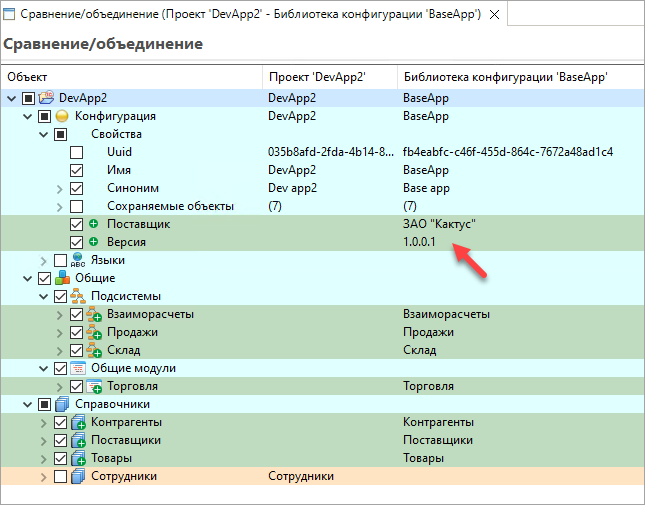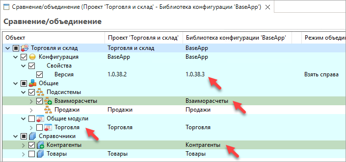 - 1C:EDT откроет редактор сравнения и объединения. В нем вы увидите, что