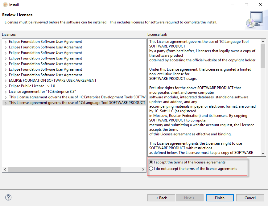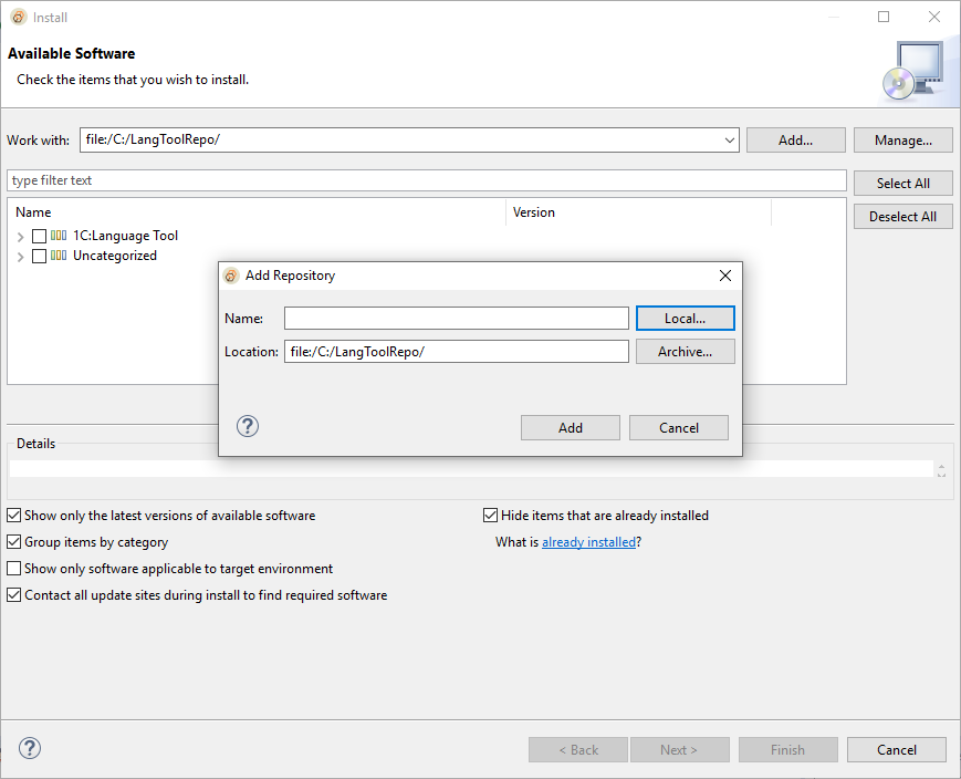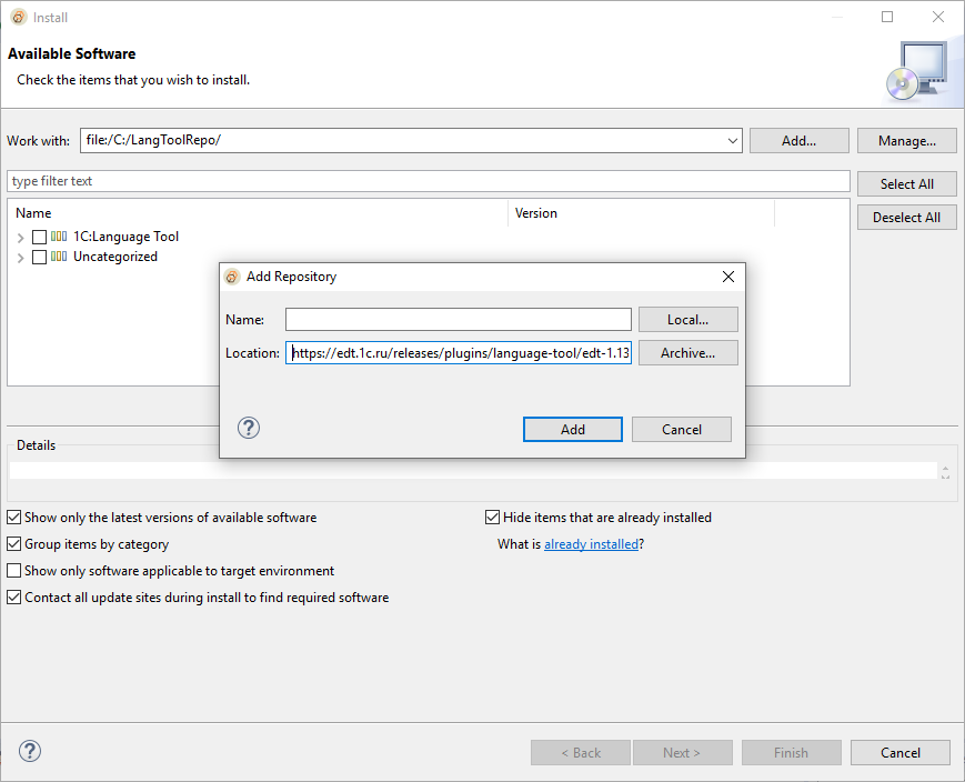 1C:Language Tool поставляется в виде репозитория Eclipse. Установка расширения может