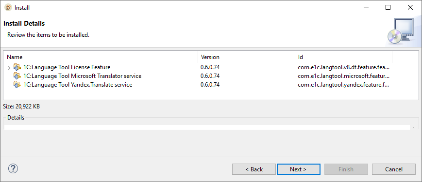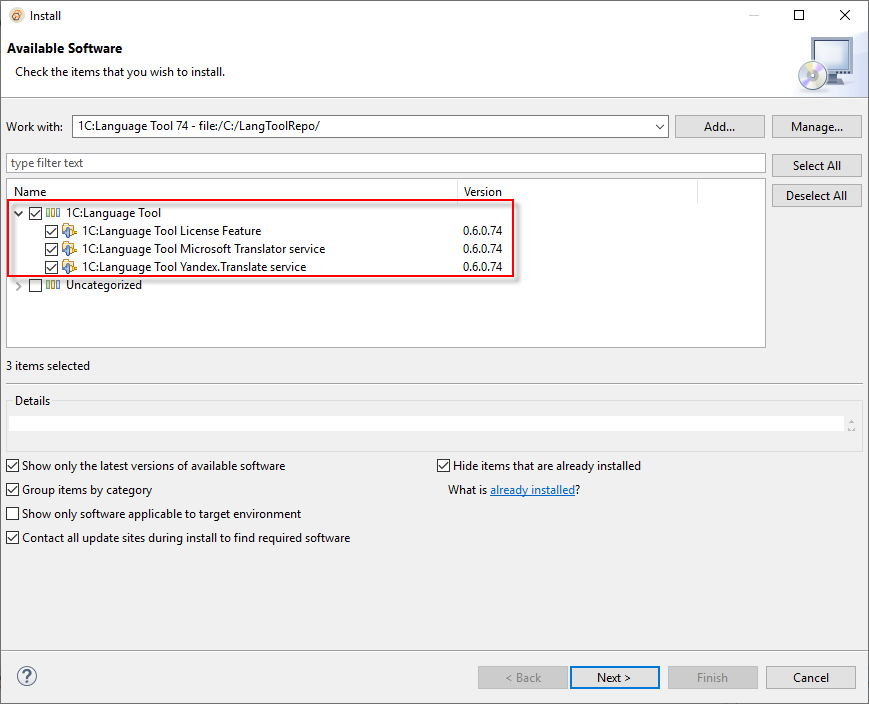 - Отметьте компонент 1C:LanguageTool и нажмите кнопку
