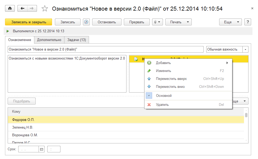 Для процессов Исполнение и Ознакомление определена особая логика при создании на основании задач процесса Рассмотрение – предметы в процессах Исполнение и Ознакомление имеют те же роли, что и в процессе Рассмотрение.