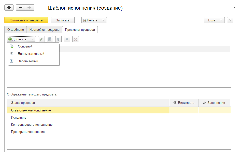Заполняемые – особые предметы, которые должны быть заполнены в определенных задачах процесса. Но процесс, в котором происходит заполнение предметов не направлен на выполнение действий над ними. Обычно в рамках одного процесса происходит заполнение предмета, а в рамках другого – действие над предметом. Например, в процессе Исполнение следует подготовить проект договора, а в процессе Согласование – согласовать договор.