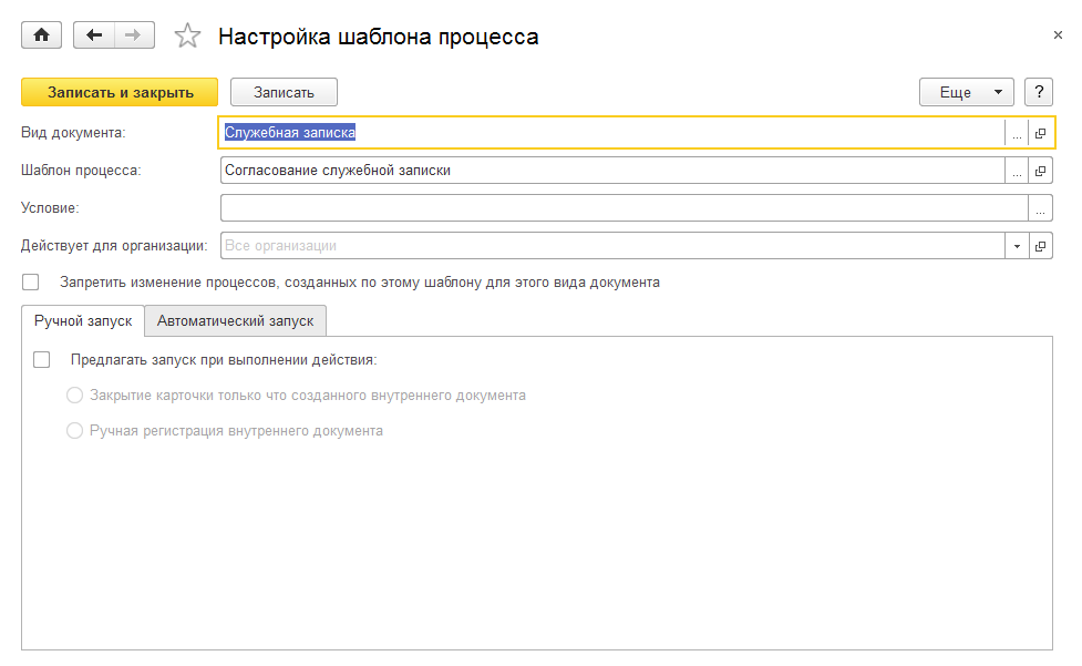 Если настройка Предлагать запуск при выполнении действия установлена, то при закрытии карточки только что созданного документа или при ручной регистрации программа предложит пользователю запустить процесс по настроенному шаблону (нескольким шаблонам, если данному виду документов назначено несколько шаблонов процессов).
