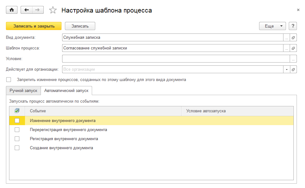 Ответственный за шаблоны процессов сотрудник настраивает старт процессов по событиям в форме ФормаЗаписи регистра НастройкаШаблоновБизнесПроцессов или ПравилаАвтоматическогоЗапускаБизнесПроцессов. Настройки в обоих случаях сохраняются в регистр сведений ПравилаАвтоматическогоЗапускаБизнесПроцессов. За сохранение отвечают процедуры СохранитьПравилоАвтоматическогоЗапускаБизнесПроцессов и ПолучитьБизнесСобытияПоВидуДокумента общего модуля БизнесСобытияВызовСервера.