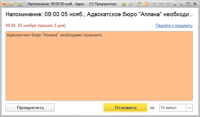 Возможность напоминаний вынесена на форму элемента записи календаря, для возможности установки напоминаний без открытия дополнительных форм в простых случаях. В случае необходимости установки непредусмотренного простого срока напоминания используется форма НапоминаниеДокументооборот.