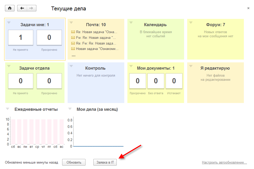 Рассмотрим пример отправки заявки в IT-отдел из окна Текущие дела.