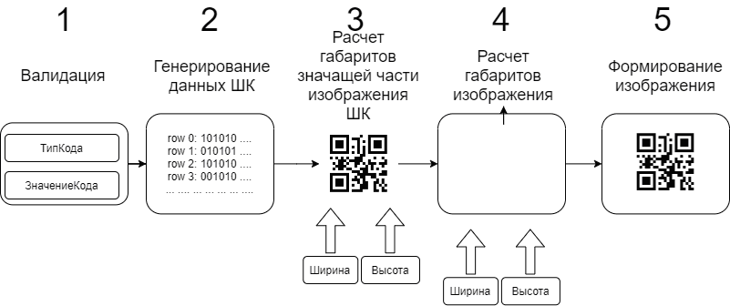 Внешний компонент "1С:Печать штрихкодов" реализует следующий алгоритм генерации изображений ШК: