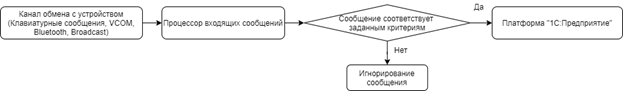 Драйвер реализует следующую схему получения и обработки данных от оборудования: данные от устройства поступают в процессор сообщений, который приводит сообщения к стандартизованному виду, после чего, если сообщение соответствует заданным при настройке драйвера критериям, то оно передается в платформу "1С: Предприятие", в противном случае игнорируется.