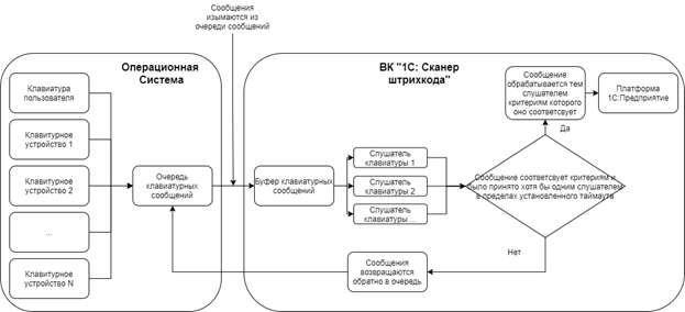 В отличие от остальных режимов взаимодействия, клавиатурный режим имеет ряд особенностей, которые отличают его от остальных. В Android, Windows и MacOS клавиатуры в отличие от остальных устройств, представлены общей очередью клавиатурных сообщений. Это приводит к тому, что работа с очередью сообщений на этих системах затрагивает пользовательский ввод. Так же требуется отдельный подход при подключении нескольких обработчиков, работающих с оборудованием в клавиатурном режиме. Поэтому, в случае клавиатурного режима взаимодействие с оборудованием выглядит несколько иначе. ОС формирует очередь клавиатурных сообщений от всех клавиатурных устройств, ВК "изымает" сообщения из системной очереди сообщений, после чего предоставляет их "слушателям" – подключенным экземплярам компонента "1С:Сканер штрихкода" с клавиатурным режимом взаимодействия. Если хотя бы один слушатель принимает переданные сообщения, то в очередь они не возвращаются, а слушатель продолжает обработку и передает данные в платформу 1С. В противном случае, если сообщения остались не востребованы в пределах таймаута, указанного в настройках, ВК возвращает их обратно в очередь сообщений, и они доставляются изначальным адресатам.