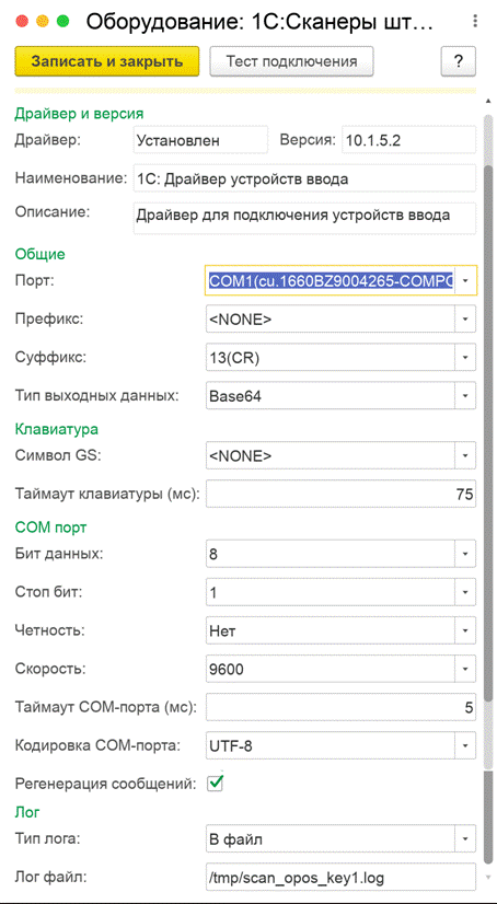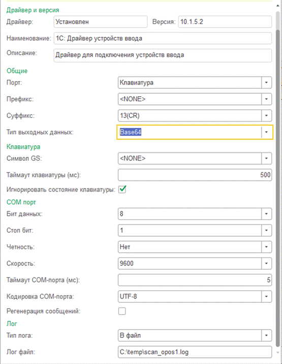 | ШтрихкодBase64 | В случае русской локали "1С: Предприятие", Типа оборудования "Сканер" и "Типа выходных данных" Base64 |