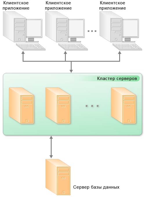 В клиент-серверном варианте работы клиентское приложение взаимодействует с кластером серверов, который, в свою очередь, осуществляет взаимодействие с сервером баз данных.