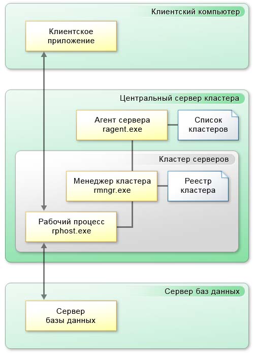 Кластер серверов 1С:Предприятия 8 является логическим понятием и представляет собой множество рабочих процессов, обслуживающих один и тот же набор информационных баз.