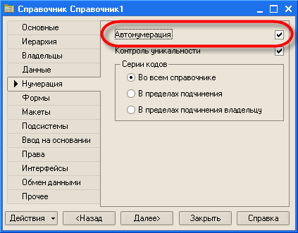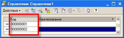 Сравним работу автонумерации в одном и другом режиме на примере добавления новых элементов в справочник, у которого установлено свойство Автонумерация: