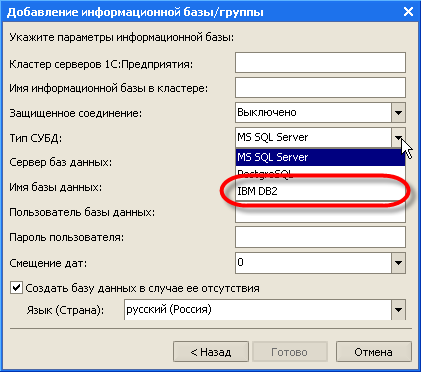 При создании информационной базы необходимо выбрать в качестве типа СУБД - IBM DB2.