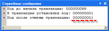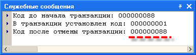 Копировать в буфер обменаНовыйЭлемент = Справочники.Справочник1.СоздатьЭлемент(); НовыйЭлемент.Код = "000000088"; Сообщить("Код до начала транзакции: " + НовыйЭлемент.Код); НачатьТранзакцию(); НовыйЭлемент.УстановитьНовыйКод(); Сообщить("В транзакции установлен код: " + НовыйЭлемент.Код); ОтменитьТранзакцию(); Сообщить("Код после отмены транзакции: " + НовыйЭлемент.Код);