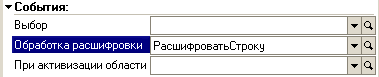 Событие "ОбработкаРасшифровки" можно обработать, только если табличный документ помещен в форму как элемент управления, а не открывается в отдельном окне, поскольку это событие существует только у элемента управления "ПолеТабличногоДокумента". Ниже показаны категория свойств "События" элемента управления "ПолеТабличногоДокумента", где назначается процедура-обработчик расшифровки: