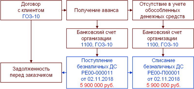 Для контракта ГОЗ-10 на рисунке 5.1 в ячейке Строка 1.1 графа 7 указана сумма 8 850 000,00 руб. Объектом расчетов по контракту ГОЗ-10 выступает договор в целом. Для корректного отражения данной суммы необходимо знать банковские счета организации, на которые поступили платежи от заказчика. До открытия отдельного счета финансирование контракта ГОЗ-10 выполнялось через расчетный счет — поступил аванс в размере 5 900 000,00 руб. Денежные средства на расчетном счете организации не имеют обособления по направлениям деятельности. Для сохранения баланса отчетности исполнения контрактов ГОЗ поступления денежных средств на расчетный счет отражаются транзитным отражением по показателю 2.1.1. Денежные средства на отдельном счете. Схема документов представлена на рисунке 5.3.