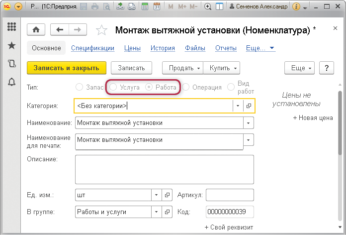 В программе деление на работы и услуги выполняется в карточке номенклатуры. Подробнее о создании номенклатуры – в разделе «Список товаров, материалов, услуг» главы «Перед началом работы».