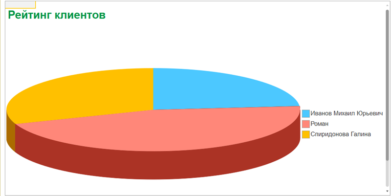 Следующий отчет — Рейтинг клиентов — будет показывать в графическом виде, каков доход от оказания услуг каждому из клиентов за все время работы ООО «На все руки мастер» (рис. 13.99).