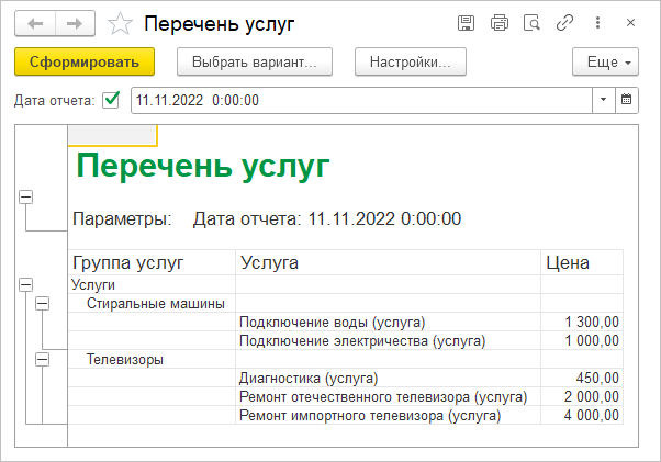 На его примере вы познакомитесь с возможностью получения последних значений из периодического регистра сведений и с возможностью вывода данных из иерархических справочников.