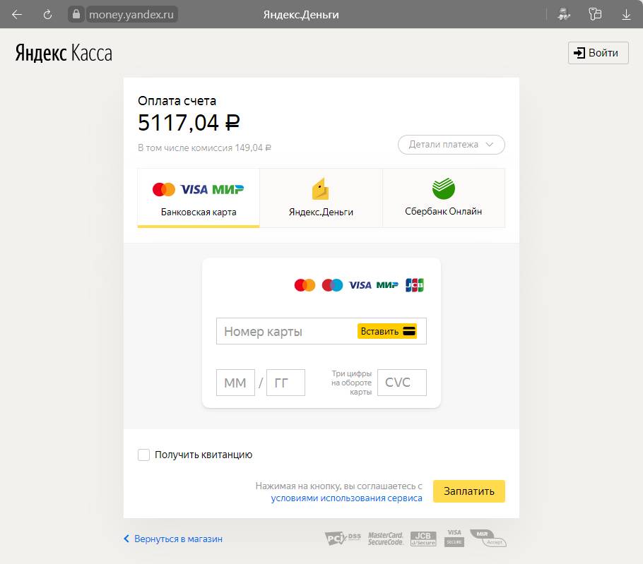 По ссылке Перейти к оплате покупатель переходит к странице оплаты. Оплата может выполнятся банковской картой, переводом «Сбербанк Онлайн» и через Яндекс.Деньги.