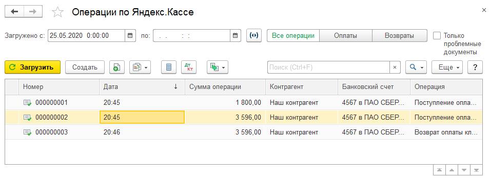 После того, как счет будет оплачен покупателем, продавец сразу же автоматически получит информациию по оплате. В программе такая оплата отражается документом Операция по Яндекс.Кассе. Документы по операциям оплаты загружаются из сервиса в рабочем месте Казначейство – Эквайринг – Операции по Яндекс.Кассе. В этом же рабочем месте можно при необходимости оформить Отмену операции оплаты или Возврат оплаты.