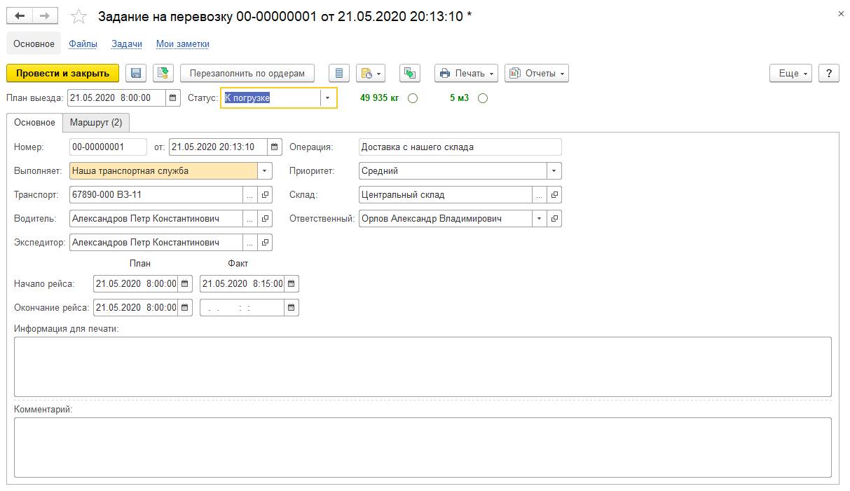 Задания на перевозку создаются в статусе Формируется. В созданных заданиях на перевозку можно уточнить информацию о водителе и экспедиторе. По созданному заданию можно напечатать маршрутный лист и комплект документов, которые должны быть переданы экспедитору, перевозчику и клиенту. После формирования и проверки заданий они поступают к выполнению, которое отражается последовательным изменением статуса К погрузке, Отправлено, Закрыто.