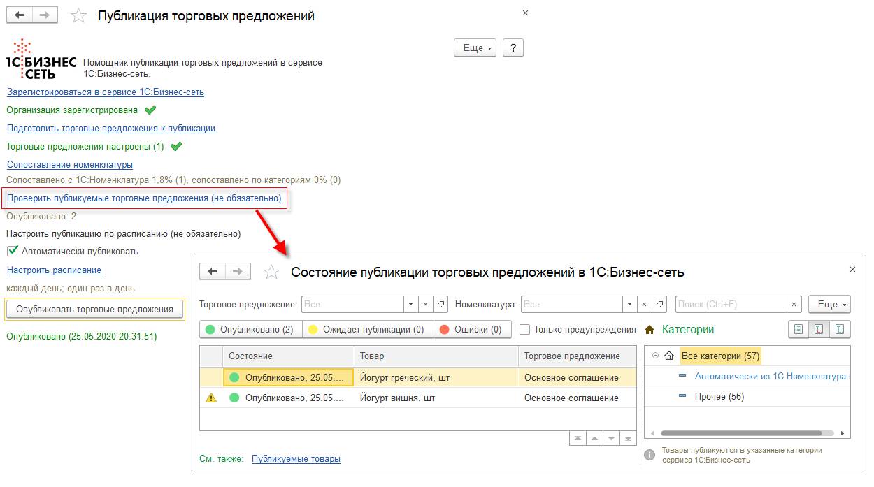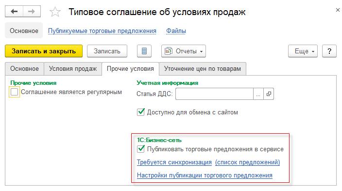 Далее необходимо выполнить синхронизацию с сервисом 1С:Бизнес-сеть из формы соглашения об условиях продаж по ссылке Требуется синхронизация и перейти к публикации торговых предложений. Для завершения публикации торговых предложений в сервисе 1С:Бизнес-сеть нужно перейти к помощнику Публикации торговых предложений (НСИ и администрирование – Обмен электронными документами – Сервис 1С:Бизнес-сеть – Публикация торговых предложений).