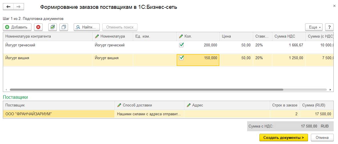 Созданный заказ также будет отправлен поставщику через 1С:Бизнес-сеть.