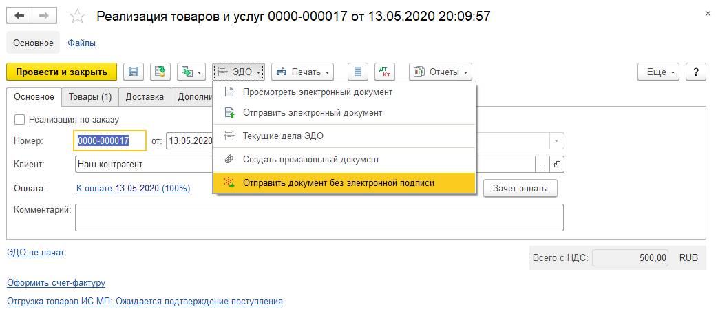 С помощью сервиса 1С:Бизнес-сеть можно решить еще одну важную в текущих условиях задачу – обмен электронными документами без электронной подписи. Такой документооборот может применяться по взаимному согласию сторон для документов, форматы и правила обмена которых не регламентированы и позволяет быстро и бесконтактно принять документы в работу и отразить в информационной базе. При этом юридически-значимый обмен документов, форматы и порядок обмена которыми регламентирован (счета-фактуры и УПД), может быть выполнен отдельно в удобное время и с выбором безопасной с эпидемиологической точки зрения формы. Отправить электронный документ через 1С:Бизнес-сеть можно непосредственно из формы документа информационной базы, используя команду ЭДО - Отправить документ без электронной подписи.