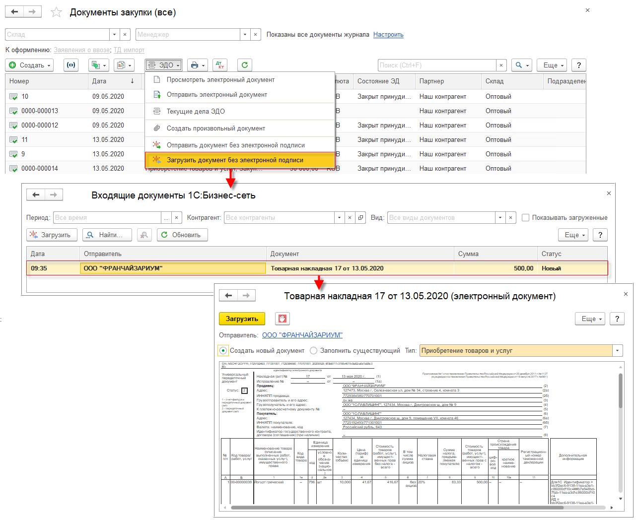 Контрагент, подключенный к сервису 1С:Бизнес-сеть, сможет получить документ из формы списка документов закупок по кнопке ЭДО – Загрузить документ без электронной подписи.