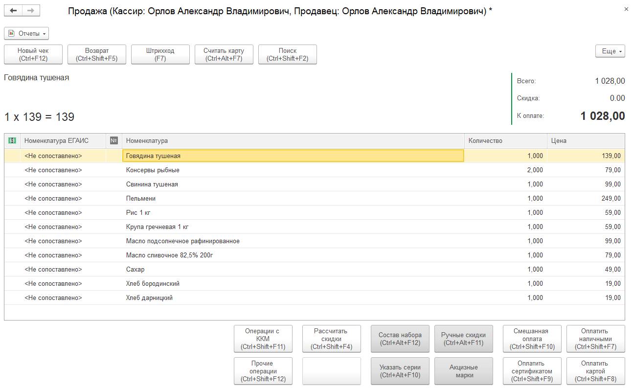 Аналогично при указании набора в форме подбора документа Реализация товаров и услуг в документ будут добавлены все позиции, входящие в набор. Таким образом, применение наборов позволяет не только упростить выбор товаров покупателем, но и существенно сокращает время на оформление продажи.