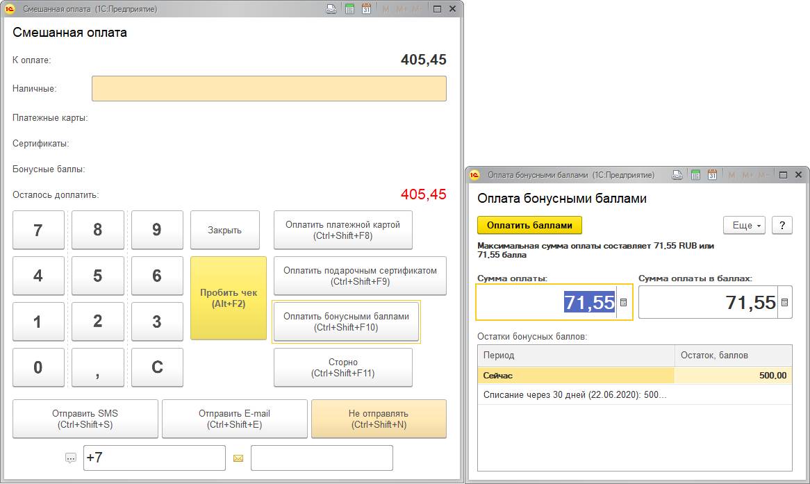 Начисление бонусных балов выполняется автоматически при оформлении документа Чек ККМ в рабочем месте кассира. Также возможно ручное начисление балов документом Начисление и списание бонусных баллов. Оплата бонусными балами возможна при оформлении Чека ККМ в рабочем месте кассира. Для этого нужно ввести номер карты лояльности по кнопке Считать карту.