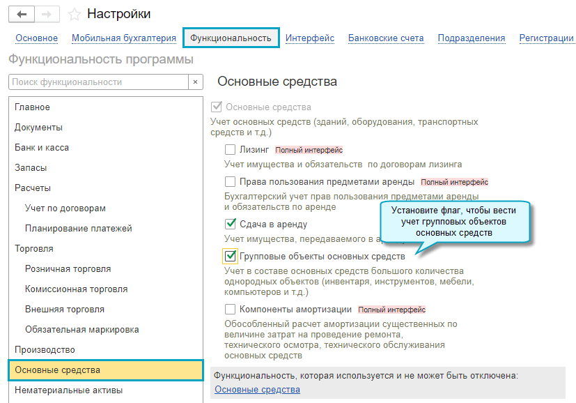 Полный интерфейс: меню "Главное - Настройки - Функциональность - Основные средства".