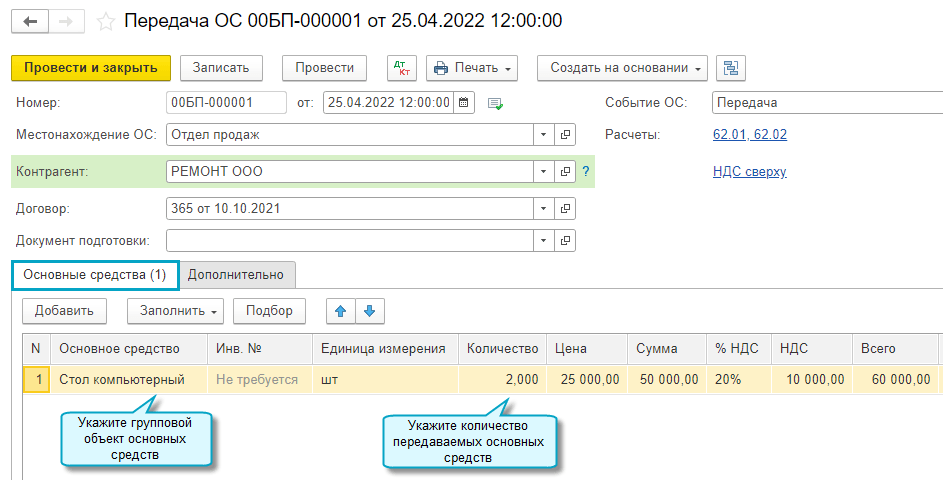 Полный интерфейс: меню "ОС и НМА - Выбытие основных средств - Передача ОС".